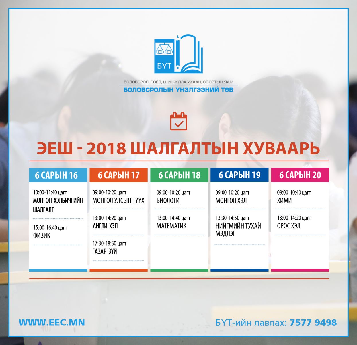 2018 онд ЭЕШ-ыг дараах хуваарийн дагуу зохион байгуулна.